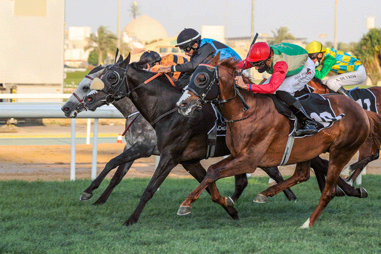 A 1600m handicap was won in the most determined fashion by AF Nafece (AF Al Buraq x Bucelia Du Cayrou by Dormane), ridden by Omani Al Moatasem Al Balushi, who was not only doubling his own account for the campaign, but also that of trainer Mohd Ramadan. The pair hit the front exiting the turn for home and shrugged off a persistent challenge from eventual third, Fakhr, and just thwarted the desperate late lunge of Dastour.
